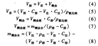 式中:V,為日溶鹽體積,m3; VA為日采鹽體積,m3 ;場余為腔體擴(kuò)大后未排出液體的溶鹽體積,m3 ; Vip1*a為腔體擴(kuò)大后未排出液體體積,m3m剩赫為腔體擴(kuò)大后未排出的液體中等效淡水溶劑質(zhì)量,kg;V排-為日排出液體體積,m3m瑰為日注人液體體積,m3; C排為日排出液體氯化鈉質(zhì)量體積濃度,歲1; C排-為日注人液體氯化鈉質(zhì)量體積濃度,g/l;C注為日排出液體密度,kg/m3 ; p注為日注人液體密度,kg/m3,P氯化鈉為氯化鈉密度,kg/m3 ; p水為水的密度,kg/m3 ; V8為階段溶鹽體積,m3 ; C聲為聲吶測量時腔體內(nèi)氯化鈉質(zhì)量體積濃度,g/1; P聲為聲吶測量時腔體內(nèi)液體密度,kg/m3kg/M。