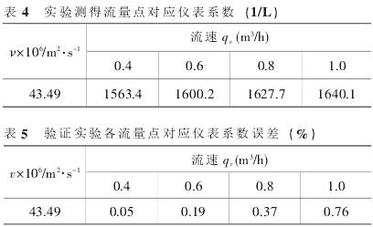 為證明該高粘度變流速自適應(yīng)算法及公式的有效性,重新選取四個流量點(diǎn):0.4m3/h、0.6m3/h、0.8m3/h、1.0m3/h對該公式以及算法進(jìn)行精度驗(yàn)證,得到表4數(shù)據(jù),表5為各對應(yīng)流量點(diǎn)的擬合后儀表系數(shù)的誤差。