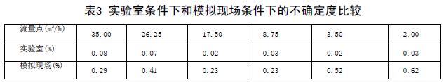 實(shí)驗(yàn)室條件下和模擬現(xiàn)場條件下的不確定度比較(表3)兩次結(jié)果可以看出,兩次實(shí)驗(yàn)各個流量點(diǎn)的不確定度差距非常大??梢姡?strong>井水流量計(jì)對安裝條件還是比較苛刻的。