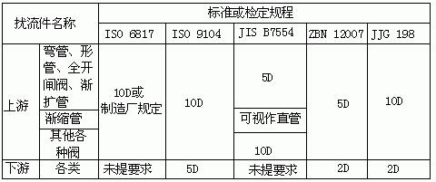 為獲得正常測(cè)量精確度,電磁流量傳感器上游也要有一定長度直管段,但其長度與大部分其它流量儀表相比要求較低。90°彎管、T形管、同心異徑管、全開閘閥后通常認(rèn)為只要離電極中心線(不是傳感器進(jìn)口端連接面)5倍直徑(5D)長度的直管段,不同開度的閥則需10D;下游直管段為(2~3)D或無要求;但要防止蝶閥閥片伸入到傳感器測(cè)量管內(nèi)。各標(biāo)準(zhǔn)或檢定規(guī)程所提出上下游直管段長度亦不一致,匯集如表1所示,要求比通常要求高,這是由于為保證達(dá)到當(dāng)前0.5級(jí)精度儀表的要求。表1