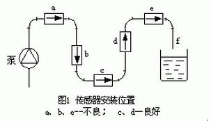 水平安裝時(shí)要使電極軸線平行于地平線,不要處于垂直于地平線,因?yàn)樘幱诘撞康碾姌O易被沉積物覆蓋,頂部電極易被液體中偶存氣泡擦過遮住電極表面,使輸出信號(hào)波動(dòng)。圖1所示管系中,c、d為適宜位置;a、b 、e為不宜位置,b處可能液體不充滿,a、e處易積聚氣體,且e處傳感器后管段短也有可能不充滿,排放口*好如f形狀所示。對(duì)于固、液兩相流c處亦是不宜位置。