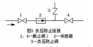 氟塑料襯里傳感器須謹(jǐn)慎地應(yīng)用于負(fù)壓管系;正壓管系應(yīng)防止產(chǎn)生負(fù)壓,例如液體溫度高于室溫的管系,關(guān)閉傳感器上下游截止閥停止運(yùn)行后,流體冷卻收縮會(huì)形成負(fù)壓,應(yīng)在傳感器附近裝負(fù)壓防止閥,如圖3所示。有制造廠規(guī)定PTFE 和PFA 塑料襯里應(yīng)用于負(fù)壓管系的壓力可在200C、1000C、1300C時(shí)使用的絕對(duì)壓力必須分別大于27、40、50KPa。