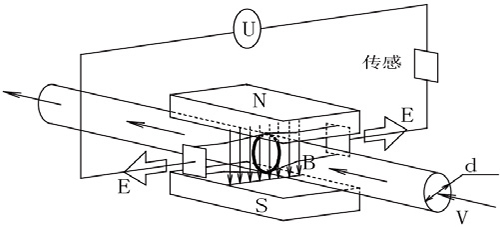 如圖,測量流量時,流體流過垂直于流動方向的磁場,導(dǎo)電性流體的流動感應(yīng)出一個與平均流速成正比的電勢。其感應(yīng)電壓信號通過兩個電極檢出,并通過電纜傳送至轉(zhuǎn)換器,經(jīng)過信號處理及相關(guān)運算后,將累計流量和瞬時流量顯示在轉(zhuǎn)換器的顯示屏上。