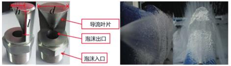 圖 1 為電弧風(fēng)扇噴嘴的結(jié)構(gòu)和噴霧,一種新型的噴嘴主要由一個(gè)衛(wèi)生型渦街流量計(jì)入口、出口和導(dǎo)流葉片組成。出流口的圓柱形設(shè)計(jì)降低了湍流強(qiáng)度。導(dǎo)流葉片類似于流線型尾部,產(chǎn)生類似于弧形風(fēng)扇形狀的衛(wèi)生型渦街流量計(jì)噴霧,其形狀類似于掘進(jìn)機(jī)的粉塵源。