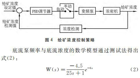 給礦濃度控制策略采用常規(guī)的PID調(diào)節(jié)器實現(xiàn),如圖4所示。在該控制系統(tǒng)中,給礦濃度設(shè)定值以及反饋的給礦濃度檢測值為PID調(diào)節(jié)器的輸 入,PID 調(diào)節(jié)器的輸出為變頻泵的頻率。該頻率可進(jìn)行自動與手動兩種控制模式。以變頻控制方式對濃密機(jī)的底流泵進(jìn)行精密轉(zhuǎn)速控制,即可控制濃密機(jī)排出的底流礦漿的濃度。